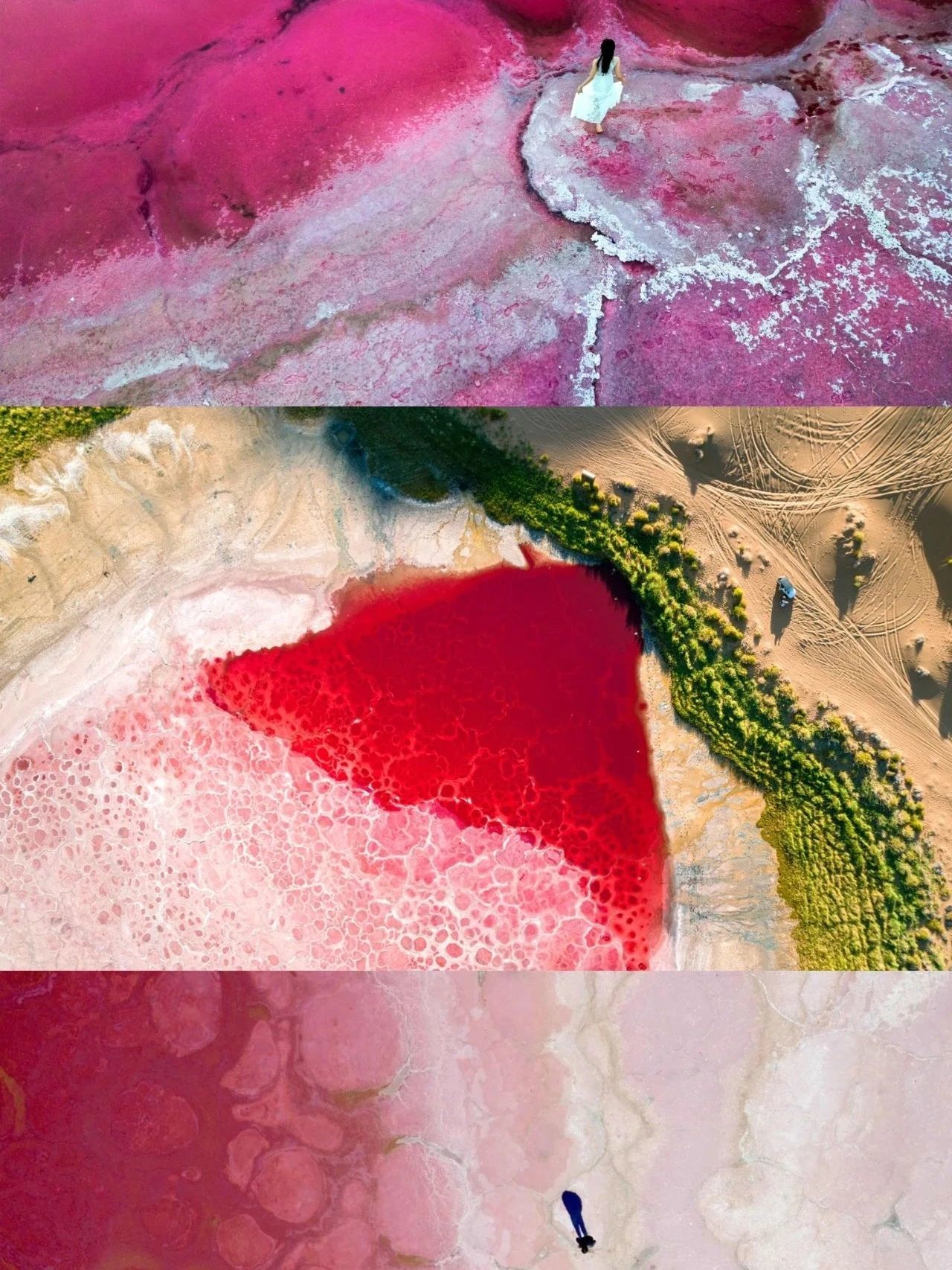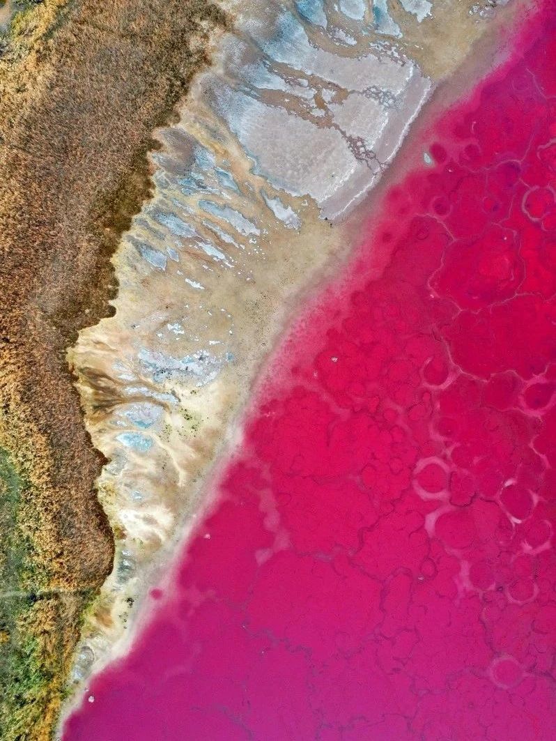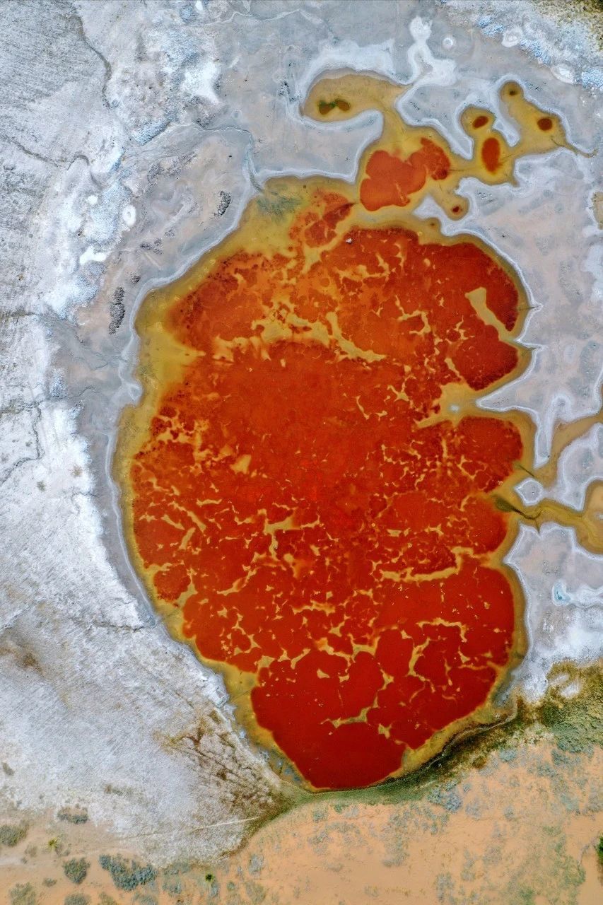 湖水的红与相近沙子的金黄酿成浓烈对比,俯视像极了一颗炽烈的腹黑,在田园之上卓绝。