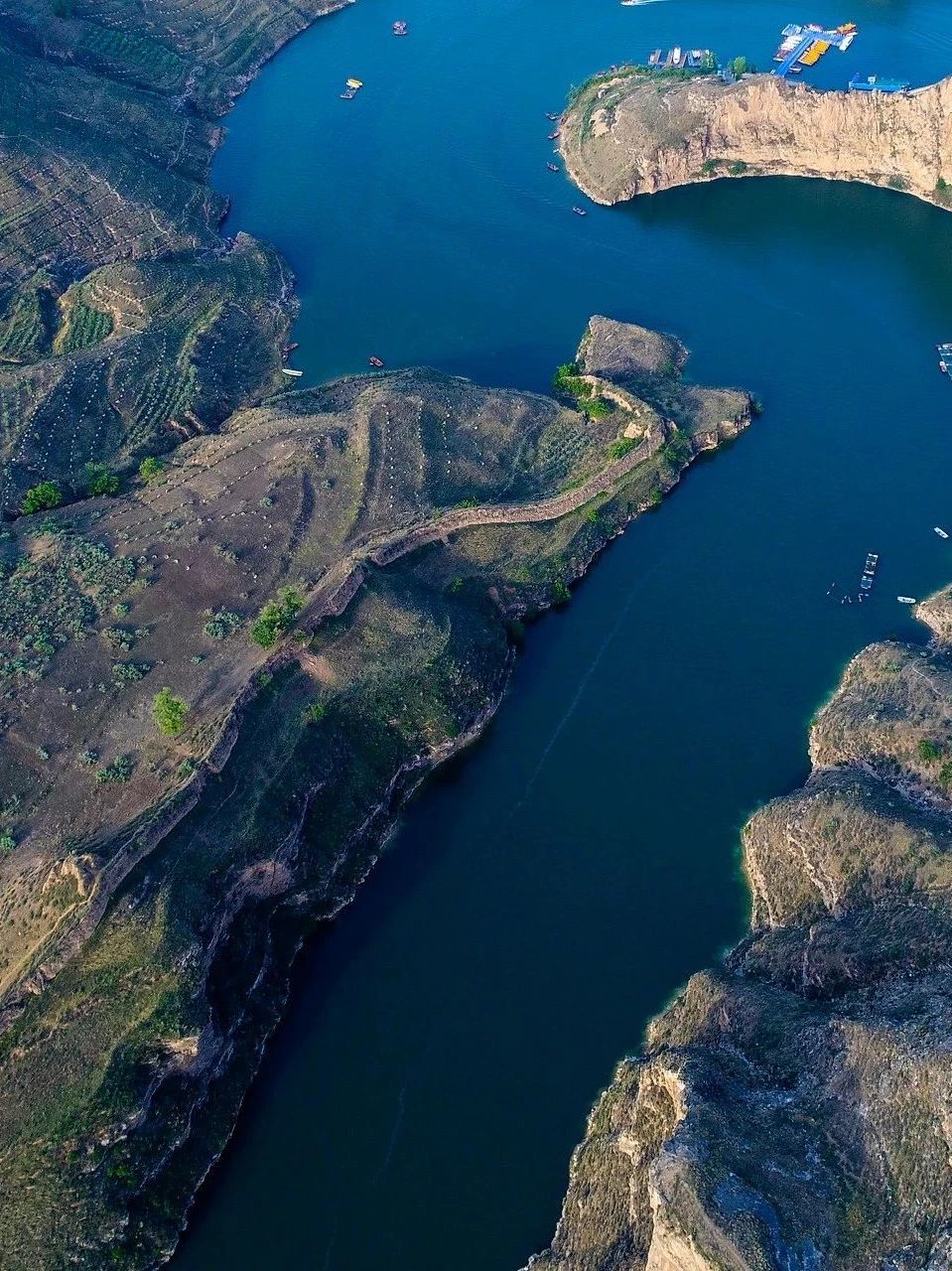在这黄河是绿的,两岸是陡峻的峭壁,中间则是河水碧波,在河岸上还能看到长城屹立,粗率走进一个屯子齐是古迹。