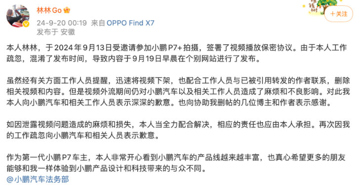 9月20日凌晨,“林林Go”在微博发布称,其于2024年9月13日受邀请干涉小鹏P7+拍摄,签署了视频播放守秘公约。由于责任漂荡,污染了发布技巧,导致推行于9月19日清早在个别网站进行了发布。