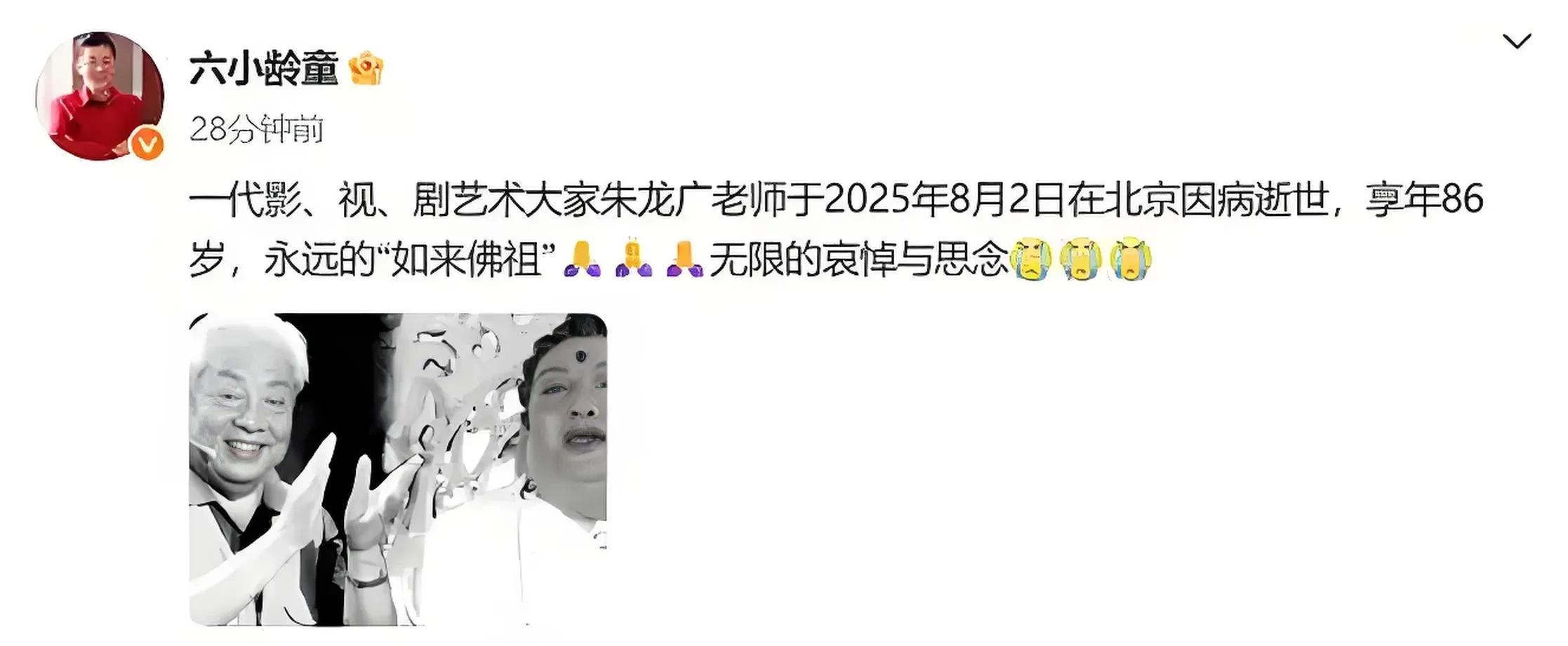 8月2日,北京传来音讯,86岁的老演员朱龙广示寂了。朱龙广在86版《西纪行》中饰演如来佛祖、《武林传奇》中饰演佟掌柜父亲佟伯达等经典扮装。