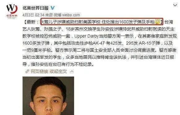 在她的“尽心”养育下,孙安佐长大恶尽然“异于常东谈主”,也算是“后起之秀而胜于蓝”了。 孙安佐18岁在好意思国读高中,一句“我要用枪挫折学校”涉嫌欺骗,遭到了好意思国警方的逮捕,还在他的寝室搜出了枪支弹药,被抓时孙安佐笑嘻嘻的说“我想看动漫”。神话狄莺花了三千万台币想见识给他减刑,最终关了8个月后被摈弃出境。