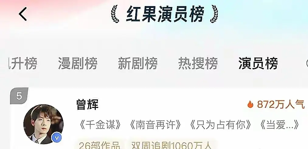 曾辉凭借出色的演技与扮装塑造,成功置身演员榜第五名,
