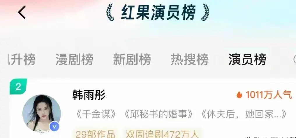 跟着《令嫒谋》的火爆,韩雨彤的热度也情随事迁,告捷高出了其他演员,跃升至红果演员榜的第二位。