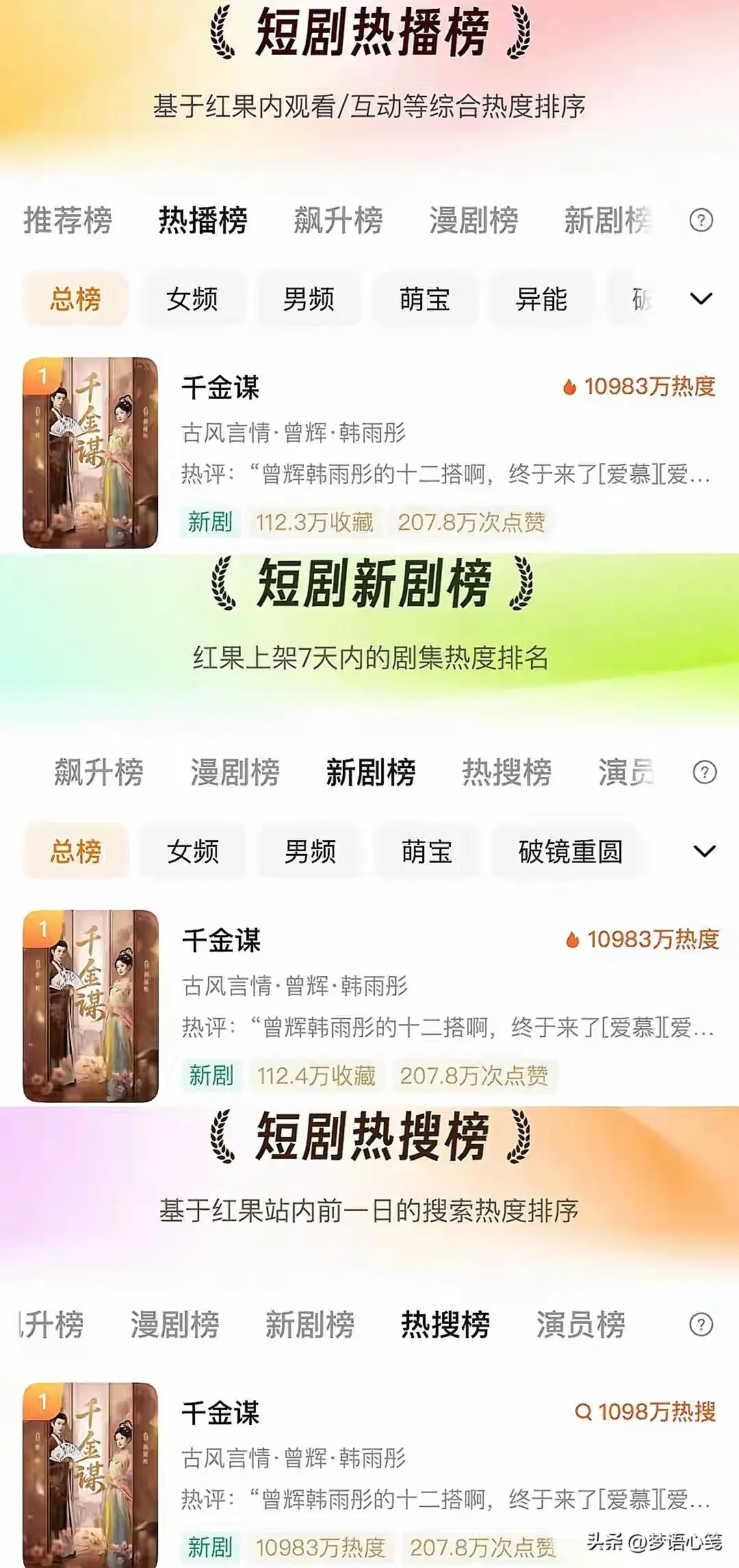 凭借其独有的剧情和两位主角的强力弘扬,该剧在红果平台一上线便掀翻了激烈反响。首日热度值高达10983万,顺利登顶红果平台的短剧热播榜、新剧榜、热搜榜三大榜单TOP1!