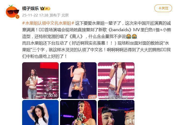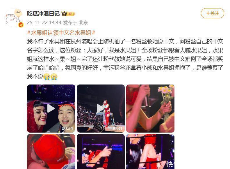 “生果姐”这一昵称,其实早已深植中国粉丝心中。从首张专辑《One of the Boys》起,她就以巨型香蕉舞台、草莓气球和生果主题服装等创意造型潜入东说念主心,中国粉丝用“生果姐”精确捕捉了她长达十余年的舞台性格。而这次她主动认领汉文名,以致现场学习犬子“雏菊”的汉文发音,被媒体评价为“外洋艺东说念主原土化营销的典范”。