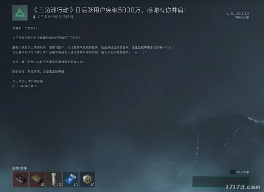 为感谢雄壮玩家的支撑,《三角洲作为》方法组已于3月18日晚通过游戏内邮件向全服玩家披发酬谢福利,通盘干员登录即可领取。