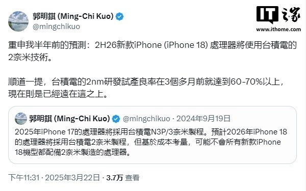 IT之家 3 月 23 日音书,苹果供应链分析师郭明錤昨日重申,iPhone 18 系列中的 A20 芯片将承袭台积电的 2nm 工艺进行制造。
